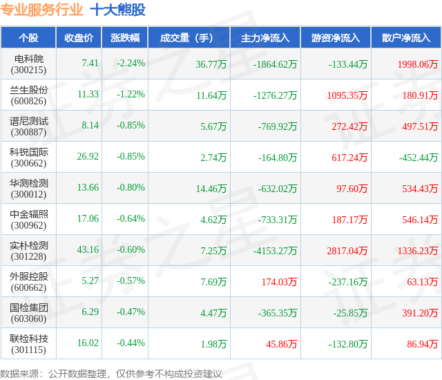 个股表现方面,专业服务行业当日领跌股为电科院(300215),该股当日报收7.41,下跌2.24%,成交量36.77万,主力资金净流出1864.62万元。兰生股份(600826)以下跌1.22%紧随其后,该股当日成交量11.64万,主力资金净流出1276.27万元。除此之外,谱尼测试(300887)、科锐国际(300662)、华测检测(300012)均进入当日熊股之列。具体个股列表见下表:
