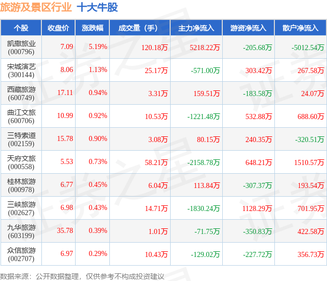 个股表现方面,旅游及景区行业当日领涨股为凯撒旅业(000796),该股当日报收7.09,上涨5.19%,成交量120.18万,主力资金净流入5218.22万元。宋城演艺(300144)以上涨1.13%紧随其后,该股当日成交量25.17万,主力资金净流出571.0万元。除此之外,西藏旅游(600749)、曲江文旅(600706)、三特索道(002159)均进入当日牛股之列。具体个股列表见下表: