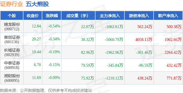 个股表现方面,证券行业当日领跌股为锦龙股份(000712),该股当日报收12.84,下跌0.54%,成交量22.07万,主力资金净流出1062.61万元。首创证券(601136)以下跌0.34%紧随其后,该股当日成交量30.32万,主力资金净流出5060.79万元。除此之外,长城证券(002939)、中泰证券(600918)、湘财股份(600095)均进入当日熊股之列。具体个股列表见下表: