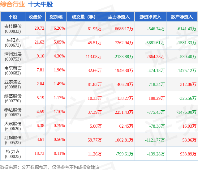 个股表现方面,综合行业当日领涨股为粤桂股份(000833),该股当日报收20.72,上涨6.26%,成交量61.95万,主力资金净流入6688.17万元。东阳光(600673)以上涨5.05%紧随其后,该股当日成交量45.51万,主力资金净流入7262.94万元。除此之外,漳州发展(000753)、南京新百(600682)、亚泰集团(600881)均进入当日牛股之列。具体个股列表见下表: