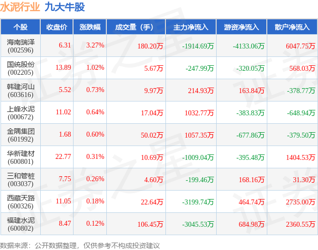 个股表现方面,水泥行业当日领涨股为海南瑞泽(002596),该股当日报收6.31,上涨3.27%,成交量180.2万,主力资金净流出1914.69万元。国统股份(002205)以上涨1.02%紧随其后,该股当日成交量5.67万,主力资金净流出247.99万元。除此之外,韩建河山(603616)、上峰水泥(000672)、金隅集团(601992)均进入当日牛股之列。具体个股列表见下表:
