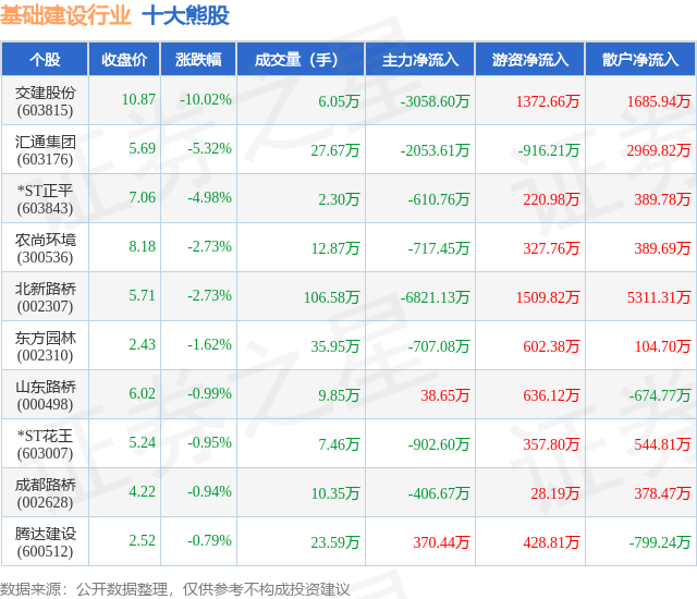 个股表现方面,基础建设行业当日领跌股为交建股份(603815),该股当日报收10.87,下跌10.02%,成交量6.05万,主力资金净流出3058.6万元。汇通集团(603176)以下跌5.32%紧随其后,该股当日成交量27.67万,主力资金净流出2053.61万元。除此之外,*ST正平(603843)、农尚环境(300536)、北新路桥(002307)均进入当日熊股之列。具体个股列表见下表:
