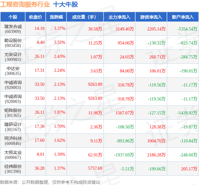 个股表现方面,工程咨询服务行业当日领涨股为建发合诚(603909),该股当日报收14.1,上涨3.37%,成交量30.58万,主力资金净流入3149.4万元。勘设股份(603458)以上涨3.32%紧随其后,该股当日成交量11.25万,主力资金净流入954.06万元。除此之外,尤安设计(300983)、中达安(300635)、中诚咨询(920003)均进入当日牛股之列。具体个股列表见下表: