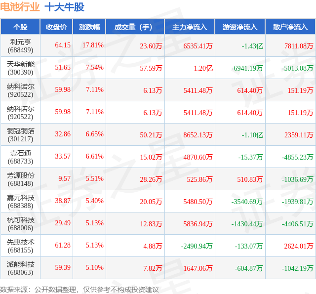 个股表现方面,电池行业当日领涨股为利元亨(688499),该股当日报收64.15,上涨17.81%,成交量23.6万,主力资金净流入6535.41万元。天华新能(300390)以上涨7.54%紧随其后,该股当日成交量57.59万,主力资金净流入1.2亿元。除此之外,纳科诺尔(920522)、纳科诺尔(920522)、铜冠铜箔(301217)均进入当日牛股之列。具体个股列表见下表: