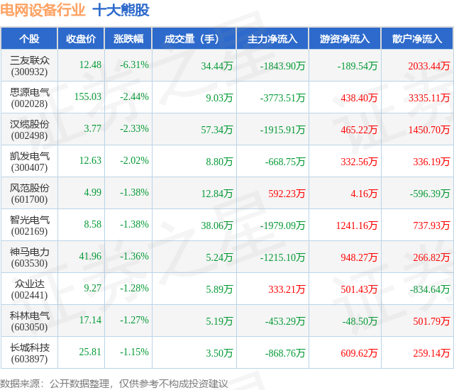 个股表现方面,电网设备行业当日领跌股为三友联众(300932),该股当日报收12.48,下跌6.31%,成交量34.44万,主力资金净流出1843.9万元。思源电气(002028)以下跌2.44%紧随其后,该股当日成交量9.03万,主力资金净流出3773.51万元。除此之外,汉缆股份(002498)、凯发电气(300407)、风范股份(601700)均进入当日熊股之列。具体个股列表见下表: