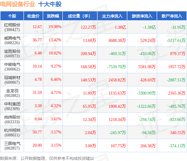 个股表现方面,电网设备行业当日领涨股为红相股份(300427),该股当日报收12.67,上涨19.98%,成交量122.27万,主力资金净流入1.38亿元。威腾电气(688226)以上涨13.42%紧随其后,该股当日成交量13.68万,主力资金净流入4688.38万元。除此之外,宝胜股份(600973)、中能电气(300062)、冠城新材(600067)均进入当日牛股之列。具体个股列表见下表: