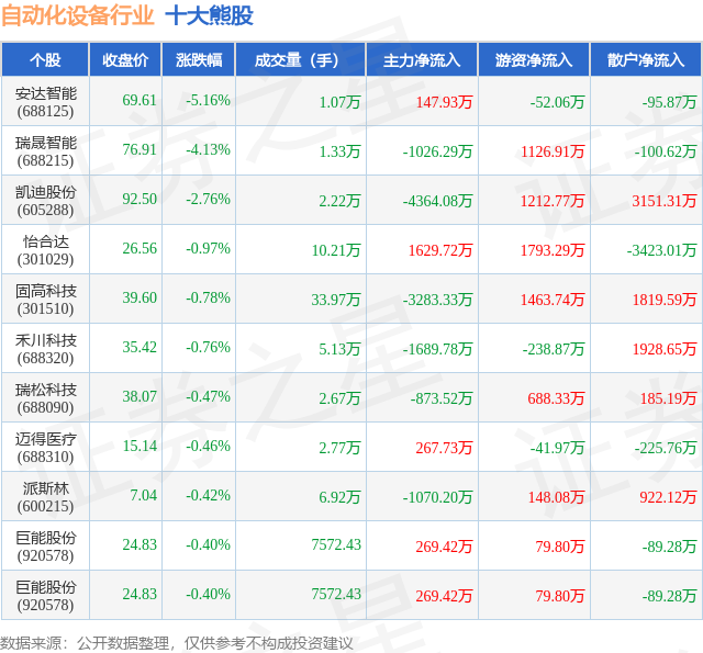 个股表现方面,自动化设备行业当日领跌股为安达智能(688125),该股当日报收69.61,下跌5.16%,成交量1.07万,主力资金净流入147.93万元。瑞晟智能(688215)以下跌4.13%紧随其后,该股当日成交量1.33万,主力资金净流出1026.29万元。除此之外,凯迪股份(605288)、怡合达(301029)、固高科技(301510)均进入当日熊股之列。具体个股列表见下表: