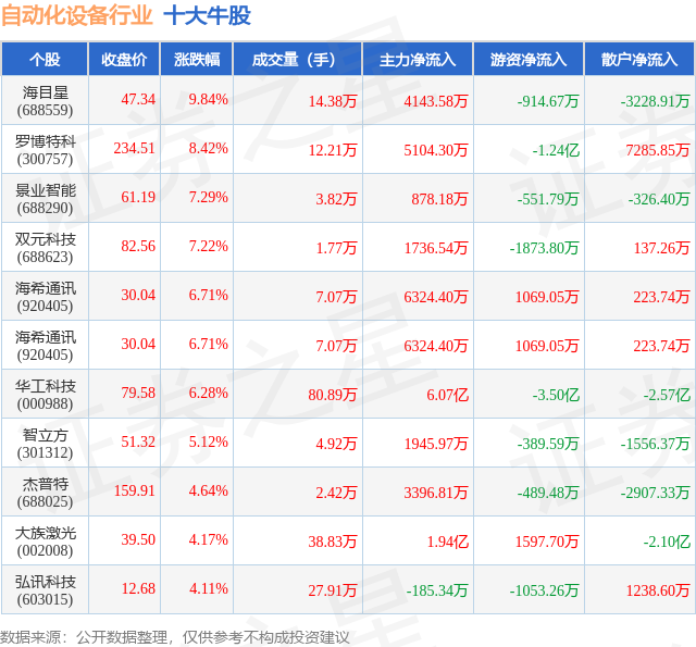 个股表现方面,自动化设备行业当日领涨股为海目星(688559),该股当日报收47.34,上涨9.84%,成交量14.38万,主力资金净流入4143.58万元。罗博特科(300757)以上涨8.42%紧随其后,该股当日成交量12.21万,主力资金净流入5104.3万元。除此之外,景业智能(688290)、双元科技(688623)、海希通讯(920405)均进入当日牛股之列。具体个股列表见下表: