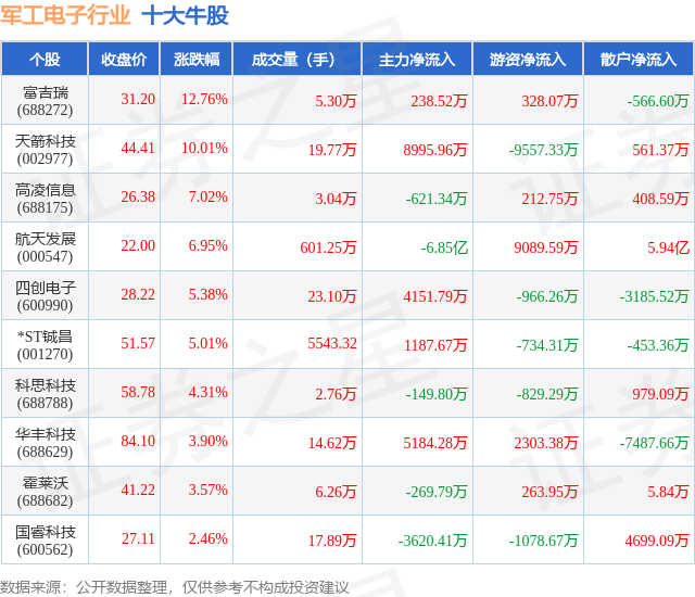个股表现方面,军工电子行业当日领涨股为富吉瑞(688272),该股当日报收31.2,上涨12.76%,成交量5.3万,主力资金净流入238.52万元。天箭科技(002977)以上涨10.01%紧随其后,该股当日成交量19.77万,主力资金净流入8995.96万元。除此之外,高凌信息(688175)、航天发展(000547)、四创电子(600990)均进入当日牛股之列。具体个股列表见下表: