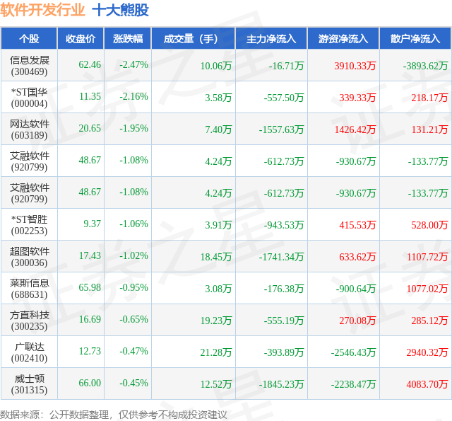 个股表现方面,软件开发行业当日领跌股为信息发展(300469),该股当日报收62.46,下跌2.47%,成交量10.06万,主力资金净流出16.71万元。*ST国华(000004)以下跌2.16%紧随其后,该股当日成交量3.58万,主力资金净流出557.5万元。除此之外,网达软件(603189)、艾融软件(920799)、艾融软件(920799)均进入当日熊股之列。具体个股列表见下表:
