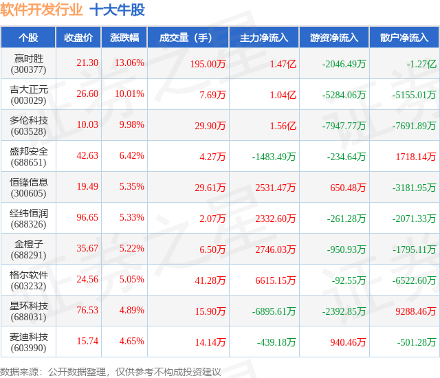 个股表现方面,软件开发行业当日领涨股为赢时胜(300377),该股当日报收21.3,上涨13.06%,成交量195.0万,主力资金净流入1.47亿元。吉大正元(003029)以上涨10.01%紧随其后,该股当日成交量7.69万,主力资金净流入1.04亿元。除此之外,多伦科技(603528)、盛邦安全(688651)、恒锋信息(300605)均进入当日牛股之列。具体个股列表见下表: