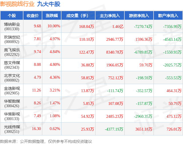个股表现方面,影视院线行业当日领涨股为博纳影业(001330),该股当日报收9.68,上涨10.0%,成交量168.04万,主力资金净流入1.46亿元。欢瑞世纪(000892)以上涨4.97%紧随其后,该股当日成交量110.1万,主力资金净流入2946.77万元。除此之外,奥飞娱乐(002292)、慈文传媒(002343)、北京文化(000802)均进入当日牛股之列。具体个股列表见下表: