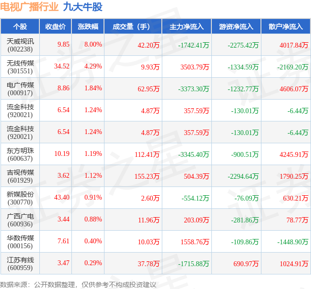 个股表现方面,电视广播行业当日领涨股为天威视讯(002238),该股当日报收9.85,上涨8.0%,成交量42.2万,主力资金净流出1742.41万元。无线传媒(301551)以上涨4.29%紧随其后,该股当日成交量9.93万,主力资金净流入3503.79万元。除此之外,电广传媒(000917)、流金科技(920021)、流金科技(920021)均进入当日牛股之列。具体个股列表见下表: