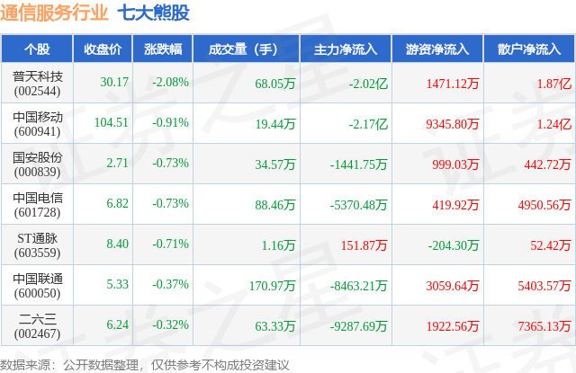 个股表现方面,通信服务行业当日领跌股为普天科技(002544),该股当日报收30.17,下跌2.08%,成交量68.05万,主力资金净流出2.02亿元。中国移动(600941)以下跌0.91%紧随其后,该股当日成交量19.44万,主力资金净流出2.17亿元。除此之外,国安股份(000839)、中国电信(601728)、ST通脉(603559)均进入当日熊股之列。具体个股列表见下表:
