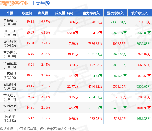 个股表现方面,通信服务行业当日领涨股为会畅通讯(300578),该股当日报收19.14,上涨6.87%,成交量13.86万,主力资金净流入1028.67万元。中富通(300560)以上涨6.13%紧随其后,该股当日成交量55.08万,主力资金净流入1394.03万元。除此之外,线上线下(300959)、宜通世纪(300310)、华星创业(300025)均进入当日牛股之列。具体个股列表见下表: