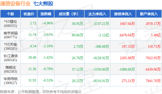 个股表现方面,通信设备行业当日领跌股为*ST精伦(600355),该股当日报收2.72,下跌4.9%,成交量30.95万,主力资金净流出3737.21万元。南京熊猫(600775)以下跌3.61%紧随其后,该股当日成交量89.86万,主力资金净流出2.12亿元。除此之外,*ST天喻(300205)、长江通信(600345)、海能达(002583)均进入当日熊股之列。具体个股列表见下表: