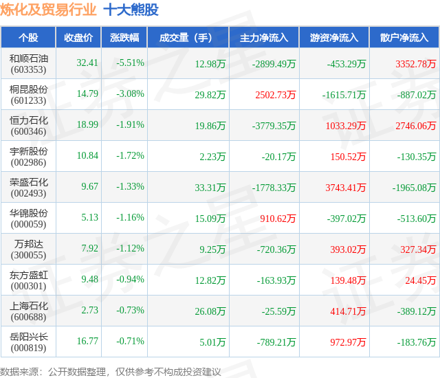 个股表现方面,炼化及贸易行业当日领跌股为和顺石油(603353),该股当日报收32.41,下跌5.51%,成交量12.98万,主力资金净流出2899.49万元。桐昆股份(601233)以下跌3.08%紧随其后,该股当日成交量29.82万,主力资金净流入2502.73万元。除此之外,恒力石化(600346)、宇新股份(002986)、荣盛石化(002493)均进入当日熊股之列。具体个股列表见下表: