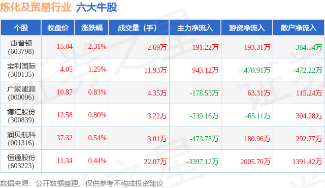 个股表现方面,炼化及贸易行业当日领涨股为康普顿(603798),该股当日报收15.04,上涨2.31%,成交量2.69万,主力资金净流入191.22万元。宝利国际(300135)以上涨1.25%紧随其后,该股当日成交量11.93万,主力资金净流入943.12万元。除此之外,广聚能源(000096)、博汇股份(300839)、润贝航科(001316)均进入当日牛股之列。具体个股列表见下表: