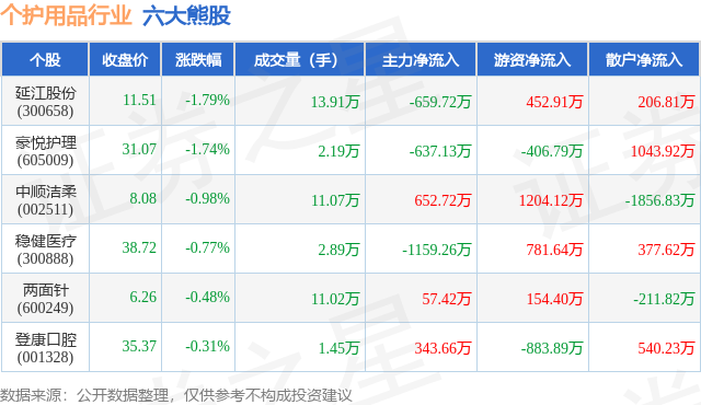 个股表现方面,个护用品行业当日领跌股为延江股份(300658),该股当日报收11.51,下跌1.79%,成交量13.91万,主力资金净流出659.72万元。豪悦护理(605009)以下跌1.74%紧随其后,该股当日成交量2.19万,主力资金净流出637.13万元。除此之外,中顺洁柔(002511)、稳健医疗(300888)、两面针(600249)均进入当日熊股之列。具体个股列表见下表:
