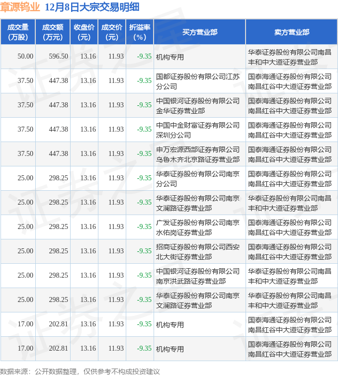 证券之星消息,12月8日章源钨业发生大宗交易,交易数据如下: