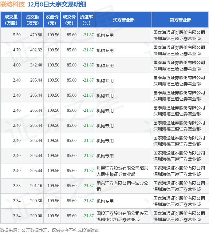 证券之星消息,12月8日联动科技发生大宗交易,交易数据如下:
