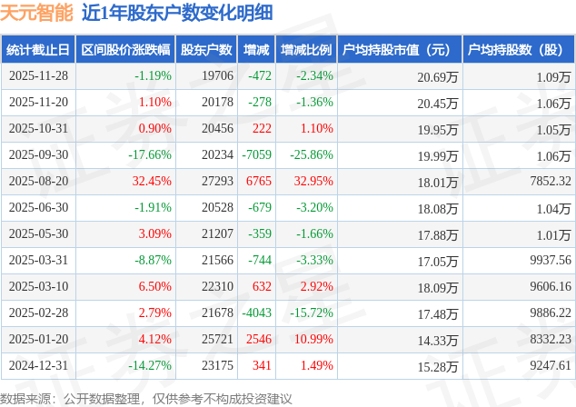 从股价来看,2025年11月20日至2025年11月28日,天元智能区间跌幅为1.19%,在此期间股东户数减少472.0户,减幅为2.34%。