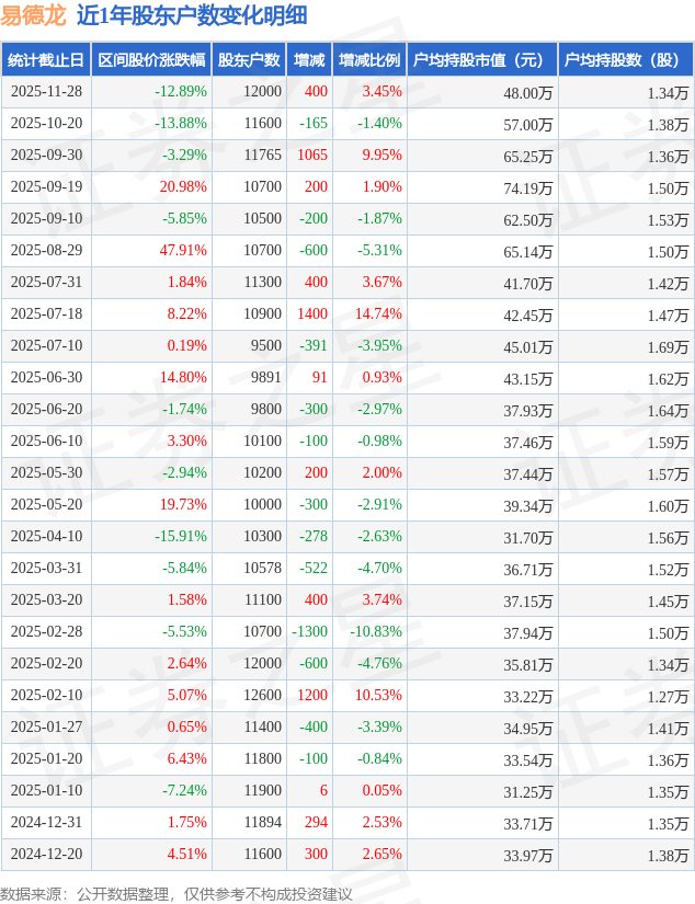 从股价来看,2025年10月20日至2025年11月28日,易德龙区间跌幅为12.89%,在此期间股东户数增加400.0户,增幅为3.45%。