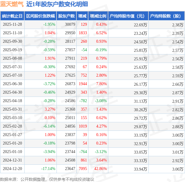 从股价来看,2025年11月10日至2025年11月28日,蓝天燃气区间跌幅为1.95%,在此期间股东户数增加129.0户,增幅为0.43%。