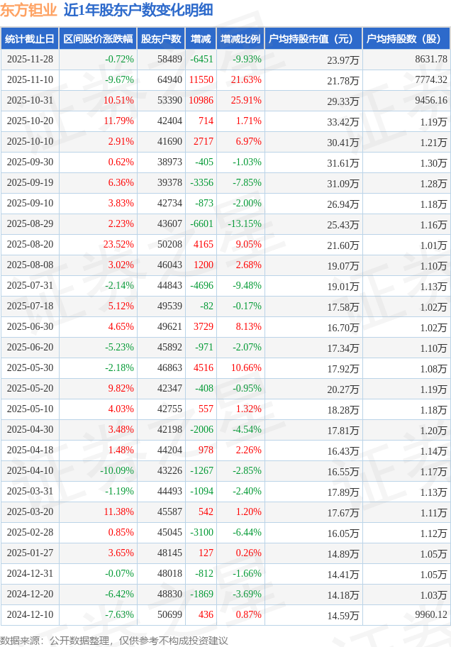 从股价来看,2025年11月10日至2025年11月28日,东方钽业区间跌幅为0.72%,在此期间股东户数减少6451.0户,减幅为9.93%。