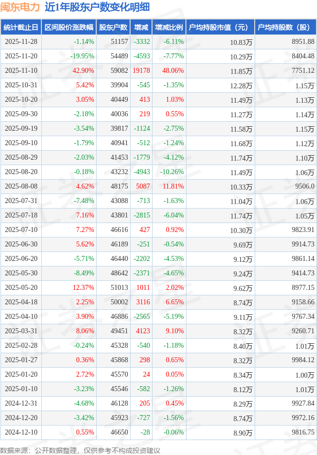 从股价来看,2025年11月20日至2025年11月28日,闽东电力区间跌幅为1.14%,在此期间股东户数减少3332.0户,减幅为6.11%。