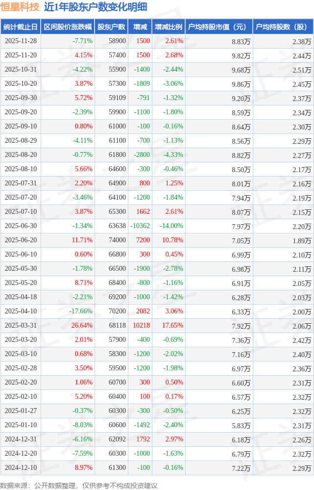 从股价来看,2025年11月20日至2025年11月28日,恒星科技区间跌幅为7.71%,在此期间股东户数增加1500.0户,增幅为2.61%。