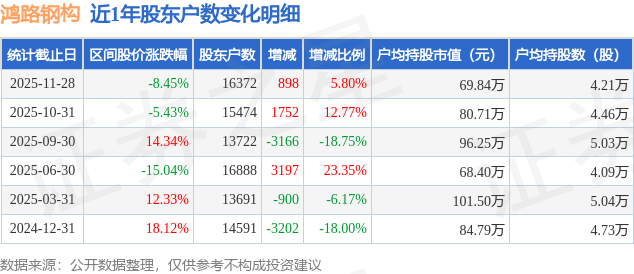 从股价来看,2025年10月31日至2025年11月28日,鸿路钢构区间跌幅为8.45%,在此期间股东户数增加898.0户,增幅为5.8%。