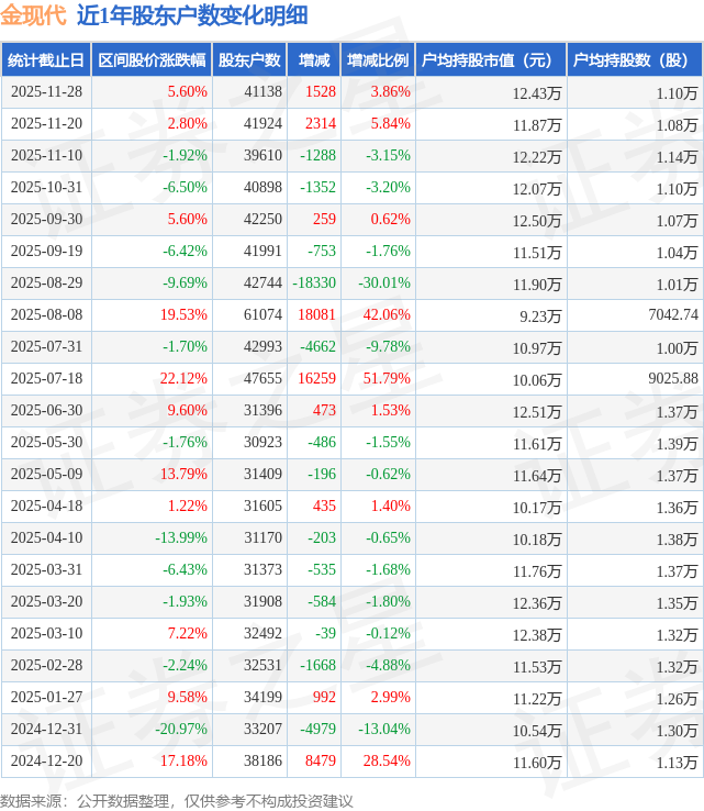 从股价来看,2025年11月10日至2025年11月28日,金现代区间涨幅为5.6%,在此期间股东户数增加1528.0户,增幅为3.86%。