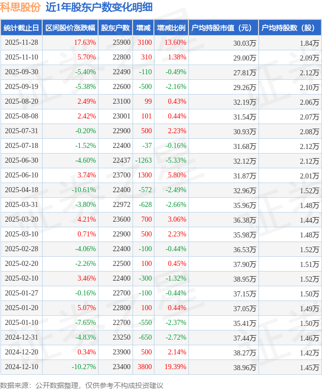 从股价来看,2025年11月10日至2025年11月28日,科思股份区间涨幅为17.63%,在此期间股东户数增加3100.0户,增幅为13.6%。