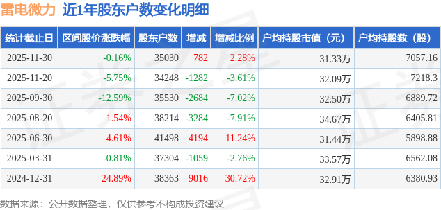 从股价来看,2025年11月20日至2025年11月30日,雷电微力区间跌幅为0.16%,在此期间股东户数增加782.0户,增幅为2.28%。