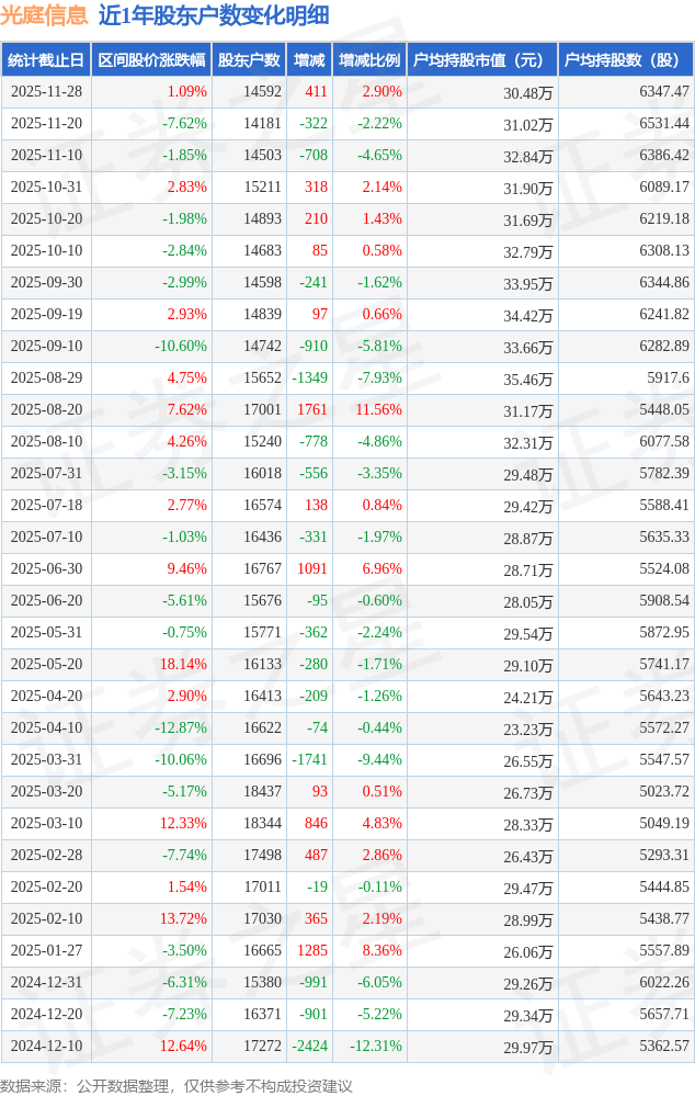 从股价来看,2025年11月20日至2025年11月28日,光庭信息区间涨幅为1.09%,在此期间股东户数增加411.0户,增幅为2.9%。