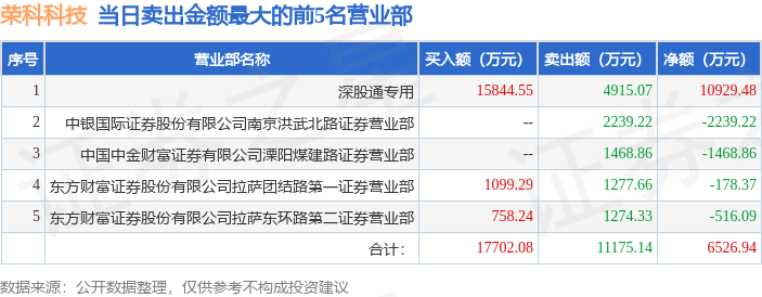 证券之星消息,沪深交易所2025年12月8日公布的交易公开信息显示,荣科科技(300290)因日涨幅达到15%的前5只证券登上龙虎榜。此次是近5个交易日内第1次上榜。
