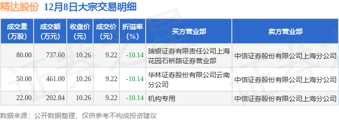 证券之星消息,12月8日精达股份发生大宗交易,交易数据如下: