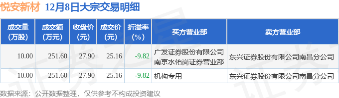 证券之星消息,12月8日悦安新材发生大宗交易,交易数据如下: