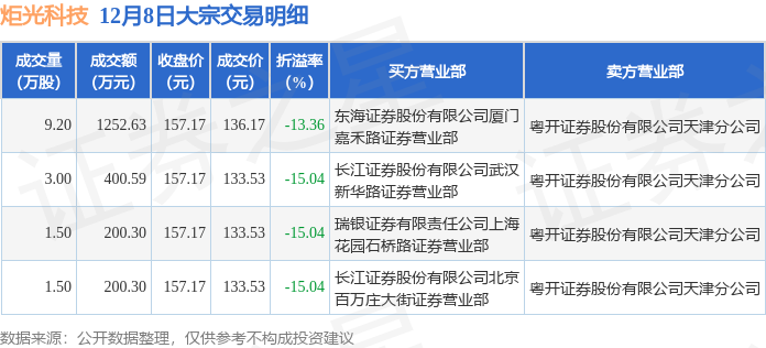 证券之星消息,12月8日炬光科技发生大宗交易,交易数据如下: