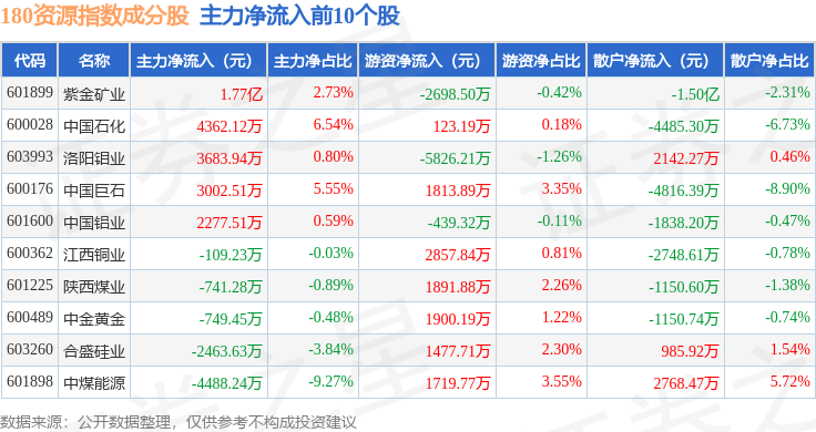资金流向方面,180资源(000026)指数成份股当日主力资金净流出合计5.31亿元,游资资金净流入合计3.22亿元,散户资金净流入合计2.1亿元。成份股资金流向详情见下表: