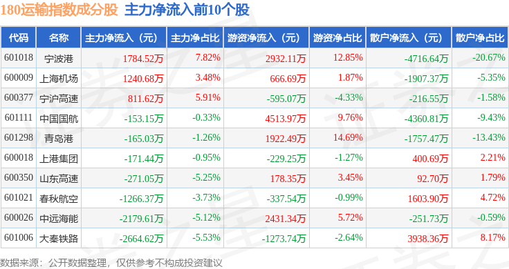 资金流向方面,180运输(000027)指数成份股当日主力资金净流出合计2.68亿元,游资资金净流入合计2.33亿元,散户资金净流入合计3507.97万元。成份股资金流向详情见下表: