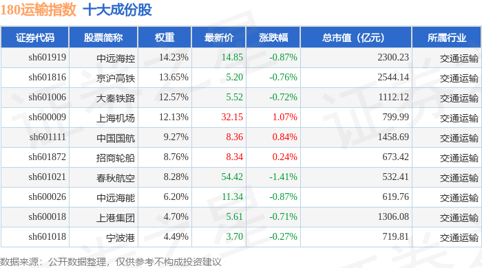 证券之星消息,12月8日,180运输(000027)指数报收于758.57点,跌0.34%,成交46.25亿元,换手率0.33%。当日该指数成份股中,上涨的有3家,上海机场以1.07%的涨幅领涨,下跌的有10家,春秋航空以1.41%的跌幅领跌。