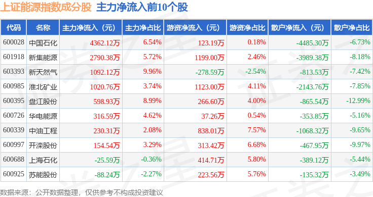 资金流向方面,上证能源(000032)指数成份股当日主力资金净流出合计6.09亿元,游资资金净流入合计3.55亿元,散户资金净流入合计2.54亿元。成份股资金流向详情见下表:
