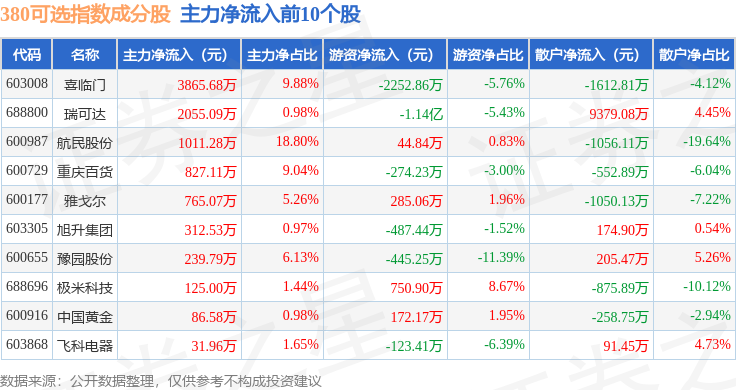 资金流向方面,380可选(000107)指数成份股当日主力资金净流出合计5.87亿元,游资资金净流入合计1921.1万元,散户资金净流入合计5.68亿元。成份股资金流向详情见下表: