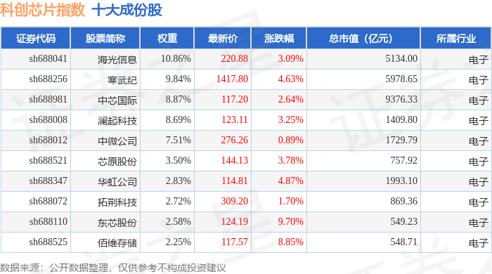 科创芯片(000685)指数十大成份股详情如下: