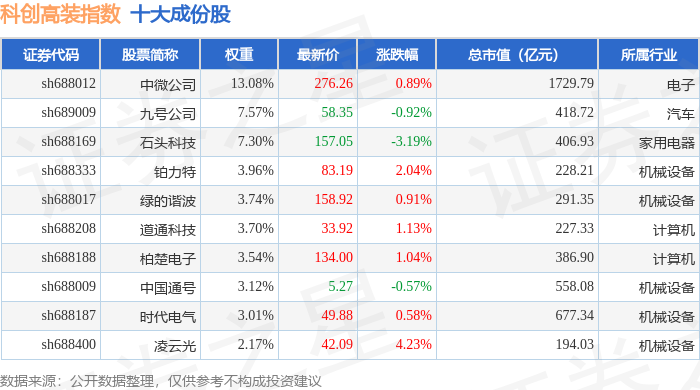 科创高装(000687)指数十大成份股详情如下: