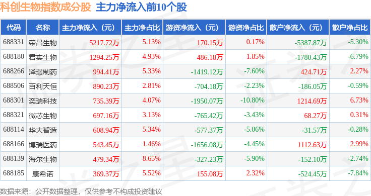 资金流向方面,科创生物(000683)指数成份股当日主力资金净流出合计1.56亿元,游资资金净流入合计6194.5万元,散户资金净流入合计9356.67万元。成份股资金流向详情见下表: