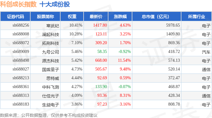 科创成长(000690)指数十大成份股详情如下: