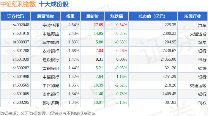 资金流向方面,中证红利(000922)指数成份股当日主力资金净流出合计4.88亿元,游资资金净流入合计1.15亿元,散户资金净流入合计3.6亿元。成份股资金流向详情见下表: